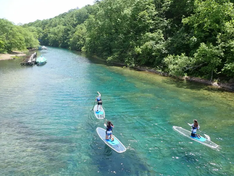 連續11年水質日本第一的支笏湖,首次在北海道使用CLEAR SUP來巡航!旅客可以在透明的SUP板上體驗閃閃發光的支笏湖藍色,就像滑水一樣輕鬆地在水面上前進,而且還貼心使用非常穩定的大型板,即使是初次嘗試的人也可以輕鬆享受。