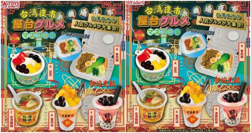 這組台灣夜市小吃扭蛋(台湾夜市の屋台グルメマスコット)總共有5款,分別是A款豆花、B款魯肉飯、C款台灣麵線、D款雪花冰和E款波霸奶茶。每一款的大小約3公分。仔細一看,台灣豆花款可說是非常還原,中間白白的是豆花,然後還有加上黑色的粉圓、黃色的芒果,但是紅色的草莓嘛,這似乎就不是必備食材了。B款魯肉飯還原度就更高了,滷蛋、青江菜和高麗菜都是必備菜色!最有趣的是,魯肉飯款還可以把便當盒關起來哦。C款的台灣麵線雖然名字略怪,但從造型可以看得出來是蚵仔麵線。E款的波霸奶茶必較講究的地方是杯身的「好啉」,這是好喝的台語漢字,沒想到連台語都能呈現出來!看來製作方非常講究呢。這組玩具預定在2023年8月上市,每扭一次定價300日幣,含稅。目前在日本樂天也能先預約哦!![]()