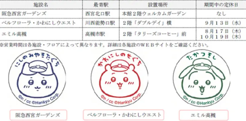 在西宮北口站的阪急西宮花園、川西能勢口站的BellFlora 川西、高槻市站的MING 阪急高槻站店,提供了不同角色的紀念章。想集滿全部,不妨直接入手 Chiikawa與阪急電鐵聯名一日套票,踩點就靠這一張!![]()