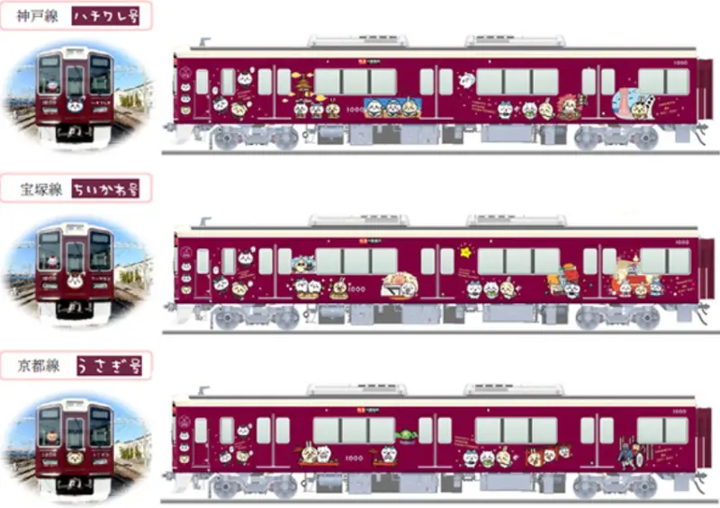 本次裝飾列車共有3輛,以「Chiikawa」(ちいかわ),「Hachiware」(ハチワレ),「Usagi」(うさぎ)三個角色的特點為靈感,分別在神戶線上運行「Hachiware號」、寶塚線上運行「Chiikawa號」、京都線上運行「Usagi號」,每台裝飾列車的第一節車廂和第八節車廂細細描繪出Chiikawa角色造訪阪急沿線各個景點的情景,而在第二節到第七節車廂的車門則印有6款結合阪急電鐵及Chiikawa角色的獨家設計。![]()