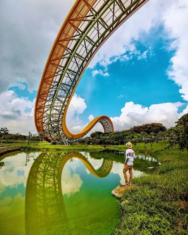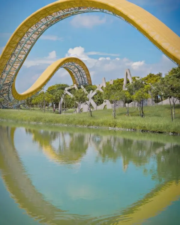迎曦湖是位在南科裡的生態休憩公園,一旁有著如雲霄飛車般的巨大黃色絲帶懸浮空中,與廣大的湖面形成壯觀的倒影美景。除了引人注目的裝置藝術外,沿湖還設有多處觀景平台,也能悠閒的享受垂釣,是當地人假日散步的好去處。