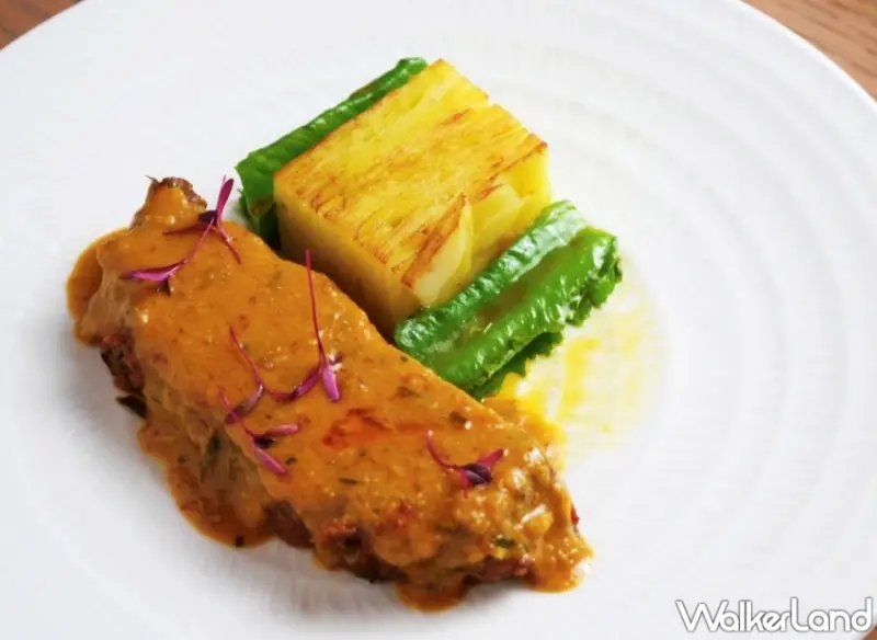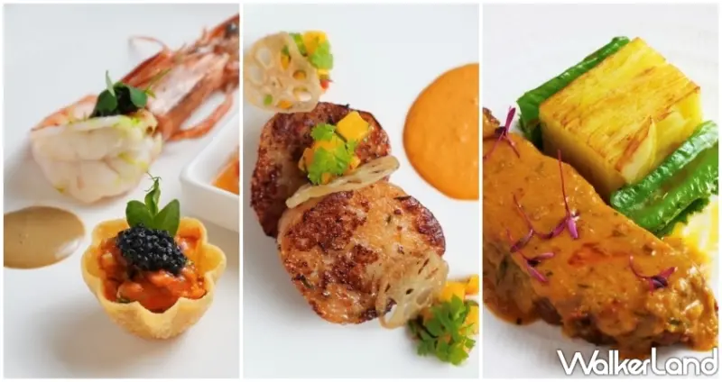 其中,在前菜方面以魚蝦蟹三者為主角,推出了「泰國香檸(kaffir lime)虎蝦佐海鮮蛋黃醬」、「辣椒蟹小金杯(pie tee)」與「檸檬羅勒鮮味紅魽(amberjack “Umai”)」。清新酸爽的泰國香檸結合肉質彈嫩的虎蝦,加上風味濃郁的自製海鮮蛋黃醬,象徵炎夏海灘戲水的熱情與活力。口感酥脆的小金杯是相當著名的娘惹小點,不僅外型討喜,更以杯中多變的餡料展現多樣風情。![]()
