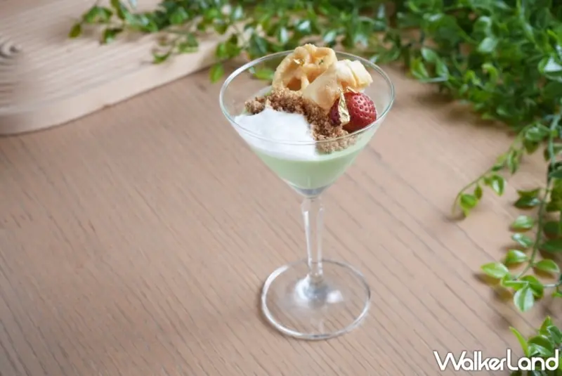 最後的甜點,主廚將自製班蘭漿融入奶酪中,在仿若玉石的外觀下是軟滑的口感,溫潤椰香伴隨班蘭花草氣息在口中綻放,搭配造型討喜口感薄脆,在馬來西亞重要節慶中必備的蜂窩餅(Kuih Loyang),為吉隆坡夏之味劃下完美句點。