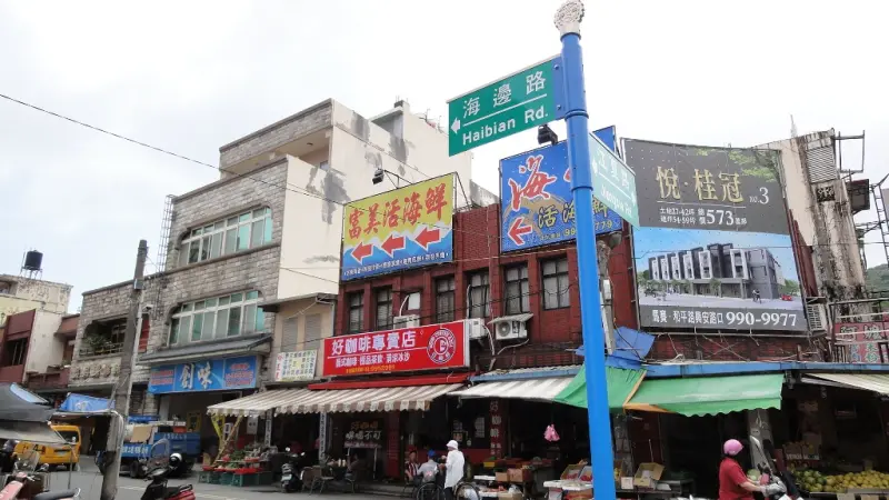 南方澳是小小的漁港,連路名都富有海洋味,圖為海邊路,以及南方澳極為出名的富美活海鮮。