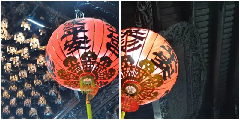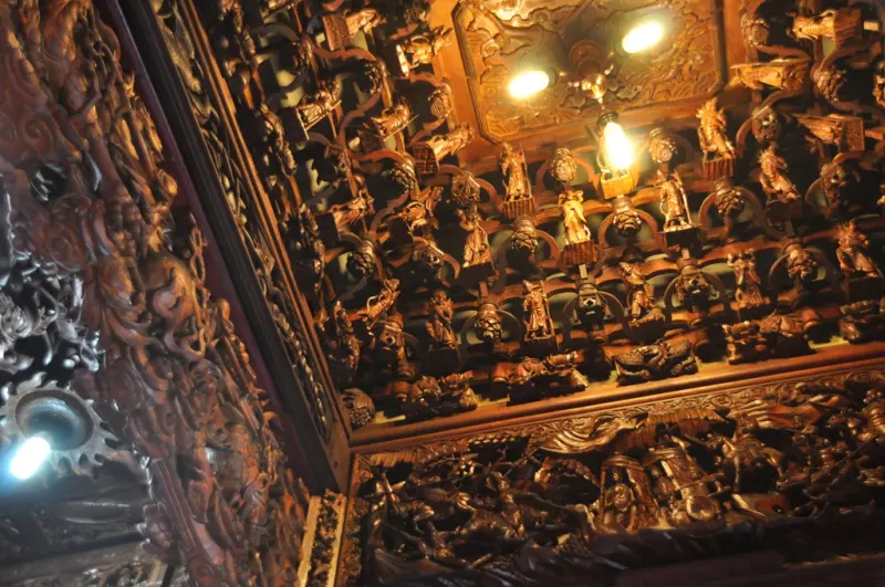 進安宮樑上細緻木雕被香火燻成富有歷史的色澤。