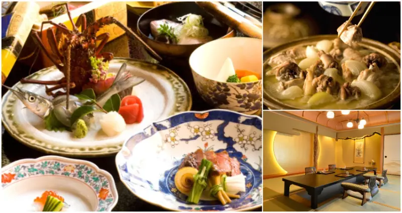 「宴席料理」是指類似酒席的宴會料理,目的是飲酒,旅館的菜品多半屬於宴席料理。而「懷石料理」是由多道菜色組合而成,口味較為清淡雅緻,目的是品茶。