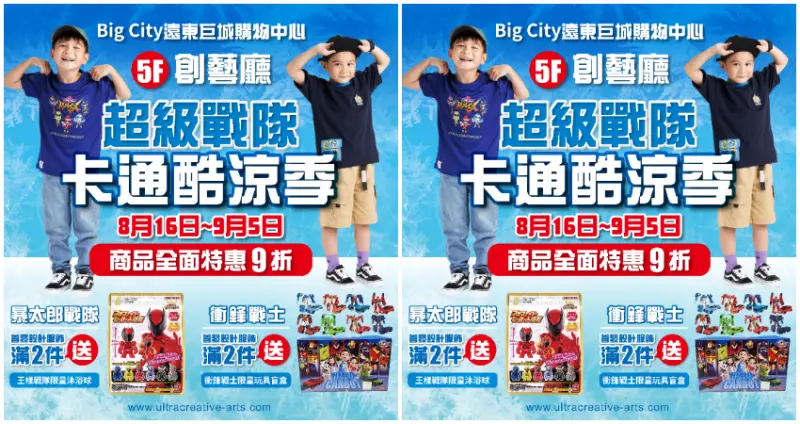 在這次的活動中,UCA奧特創藝將特別在巨城購物中心5F創藝廳,打造一間卡通快閃店,現場有暴太郎戰隊和衝鋒戰士的各種商品,包括玩具、服裝、配飾和其他相關周邊產品,除了現場全面9折外,凡購買2件還加送玩具贈品,讓小粉絲們能夠找到他們所喜愛的角色和商品,並開心地將他們帶回家。