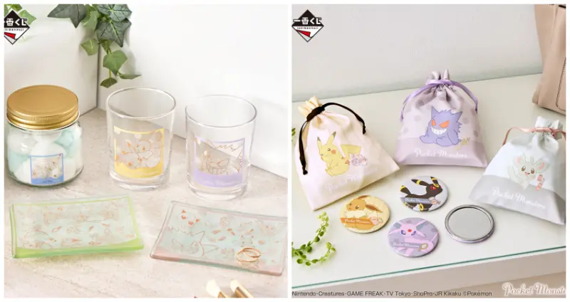 G賞就是在一番賞當中很常見且具實用性的「透明玻璃杯與盤子」,上面印了眾多寶可夢可愛的身影,很適合拿來盛裝下午茶小點心,或是當成零食與飾品收納容器;H賞則是3款束口袋與3款隨身鏡共6款獎品,抽到的話可以自由選擇自己喜歡的品項,不管是作為小物收納或是隨時整理儀容,都是出門時的最佳隊友。