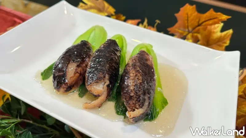 同時,還有「北極紅參鑲海鮮茸」則是傳統酒家菜,餡料的搭配與細膩手路,慢工細活中傳統風華再現。「雙椒辣炒北極紅參」、「福菜醬悶北極紅參」不容小覷的是火侯的掌控,台菜經典的爆香可謂香氣關鍵,「頂湯鮮燒北極紅參」慢火細工的頂湯是料理的靈魂,帶來滿滿的濃醇鮮。
