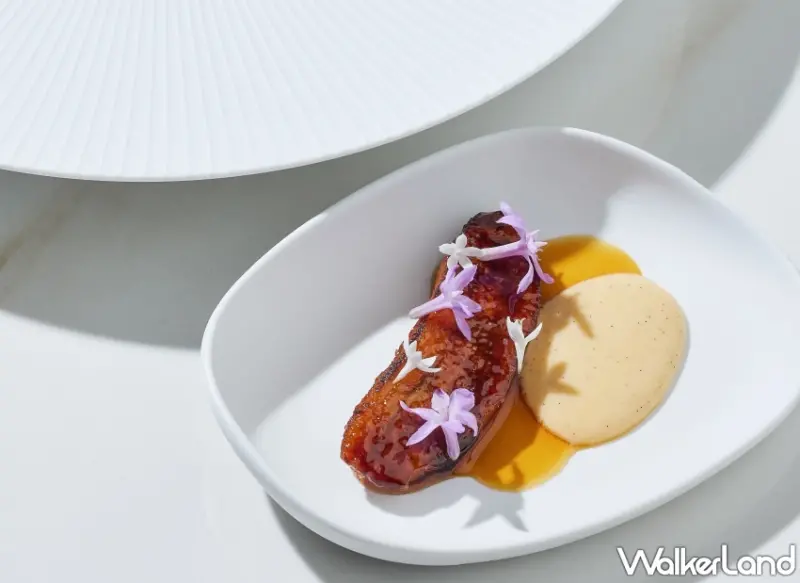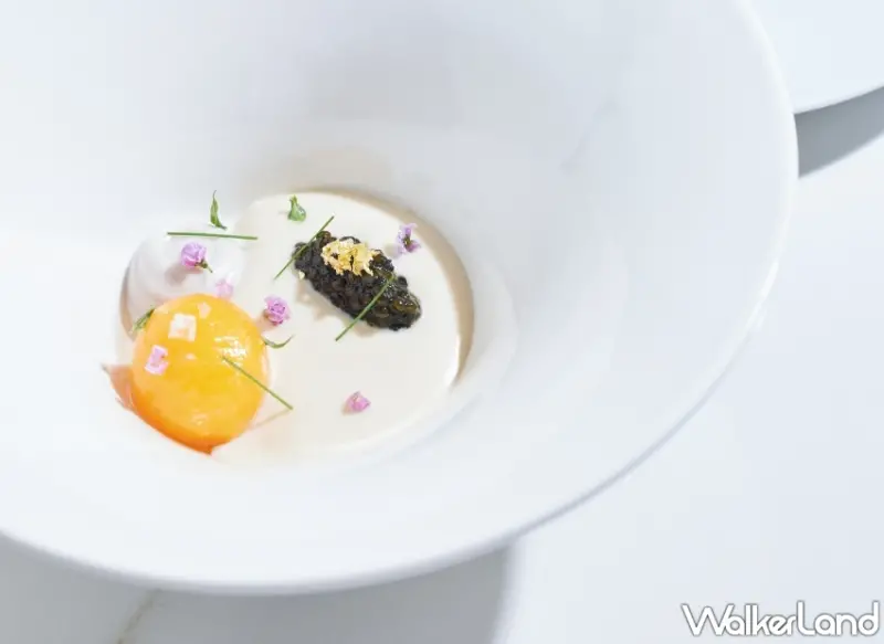 其中,前主餐「紅殼蛋 洋蔥 芋頭 馬德拉酒」蛋黃撒上馬爾頓海鹽,結合芋泥醬、洋蔥泥、魚子醬,馬德拉酒與蛋熬製的醬汁再以松露香氣畫龍點睛,搭配自製佩克里諾起司麵包,鹹甜滋味與濃郁風味為下一道登場的主餐開道。![]()