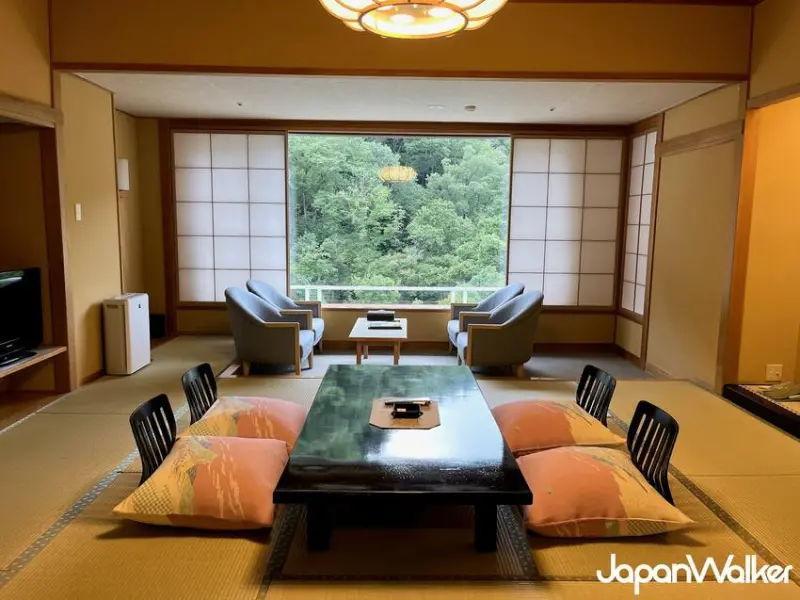 吉川屋共有128間客房,大部分皆採用傳統的日式榻榻米風格,進門後就有大片窗景迎接住客,窗前還貼心擺放了椅子,讓房客可以悠閒坐著欣賞眼前片倉山的美景,而且飯店還貼心附有「開夜床」的服務,待旅客前往享用晚餐的期間,工作人員會進房為客人鋪好睡床,讓旅客回房時有如返家一樣輕鬆自在,而且房內附的拖鞋可在館內四處移動。![]()