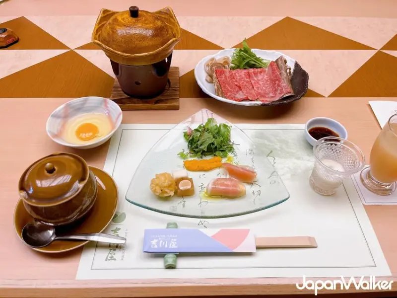 不光是雅緻客房和自傲的自家湧泉,料理的部分也是吉川屋的拿手絕活,甚至還在2022年拿下日本「第48回專家精選旅館100選」料理部門的第5名,而全館的餐廳也相當多,像是「松風」、「花之庄」、「燈花」等,而1樓大廳旁的「松風」則是館內擁有最佳視野的餐廳。晚餐的部分會依四季變換菜色,若是夏季前往,就能享用到吉川屋的招牌料理「黑毛和牛壽喜燒」、「女神藥膳美肌湯」、三陸產的「穴子壽司」、「桃子甘酒布丁」等,每一道都讓人唇齒留香、回味無窮。![]()