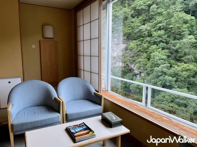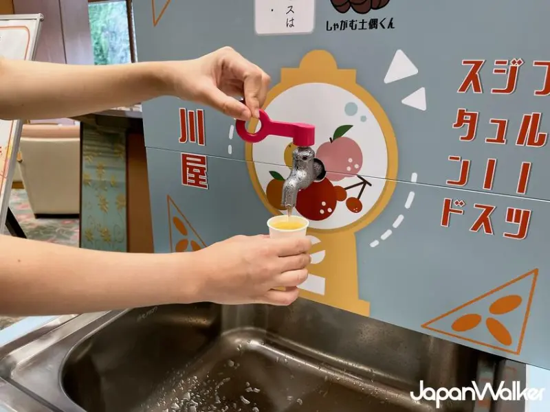 一進入吉川屋館內,相當寬廣的大廳就不禁讓人驚呼連連,一片又一片的玻璃落地窗,讓剛來到飯店的旅客們可以在休息區稍作喘息,欣賞眼前如詩如畫的四季山林美景,而且還有多種懷舊的小零食與冰棒,全部免費提供房客自行取用,最厲害的是從2023年4月以後,館內全新打造了3項設施,分別是擺放了4千本漫畫的「貓頭鷹圖書館」、擁有室內攀岩的「兒童遊樂場」以及話題滿分的「果汁水龍頭」,據說會根據不同季節提供福島當季水果製成的水果汁,只要輕輕轉開水龍頭就有新鮮的濃縮果汁流出來,可謂噱頭十足。![]()