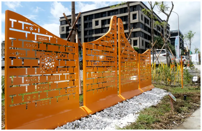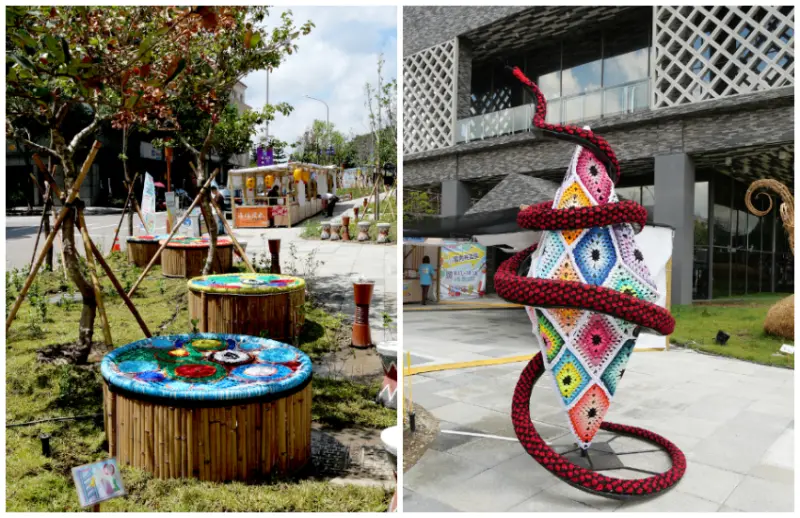 沿著市集周邊,共有5組的藝術創作,一整排花圃裡的「當我們在一起‧花之物語」靈感來自原住民族節慶的花環;「守護之眼」象徵祖靈的守護;「原客共榮」以原、客常見的地瓜,象徵原住民族的隨遇而安、客家的硬頸精神,交織的藤蔓,則代表落地生根與交融。![]()