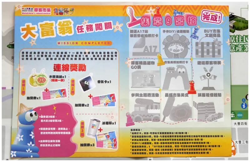 大富翁任務闖關是「原客市集」有趣又好康的活動。先到服務台拿9宮格闖關集點卡,就能依照卡片上的任務去完成,像是拍照打卡上傳社群、DIY或桌遊體驗、族服租借或品嘗美食,就能蓋章。![]()