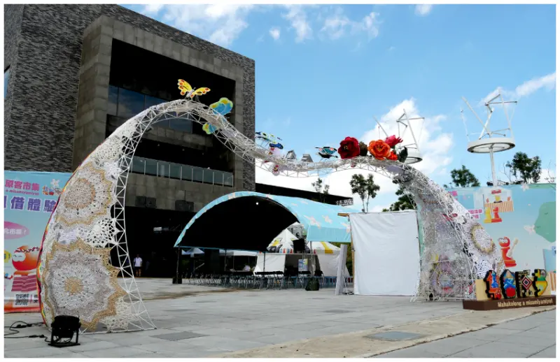 其實,一來到「原客市集」就被入口的裝置藝術所吸引。作品名稱為「原客山岳」,以山岳的意象來展現原住民族與客家族群的堅毅精神。覆蓋的織布代表了原住民族的工藝,而立體編織的蝴蝶和牡丹則是客家花布常用的元素。![]()