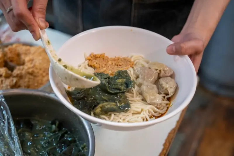 把皮蛋醬與炒手攪拌再一起,再加上店家特製辣醬真的太讚了,雙醬則是皮蛋麵再加上麻醬,麻將香氣十足,再搭配肉末辣油以及滿滿的皮蛋醬,炒手拌麵真的很夠味。<全文介紹>