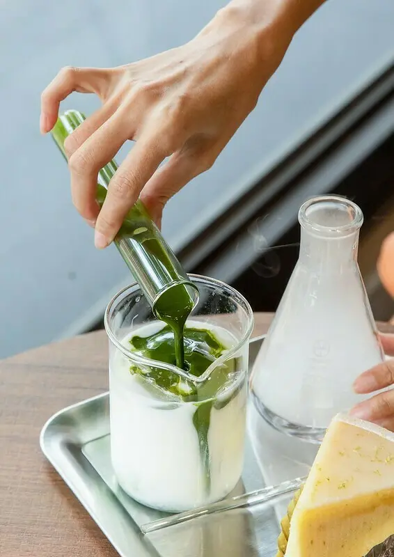 不管是果韻百香飲還是出雲抹茶都是火著乾冰效果出場,抹茶、百香果都放在試管裡,消費者可以自行添加到紅茶、或是牛奶裡的比例,也增加了一點拍攝和手作的樂趣。<全文介紹>