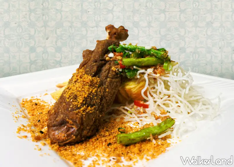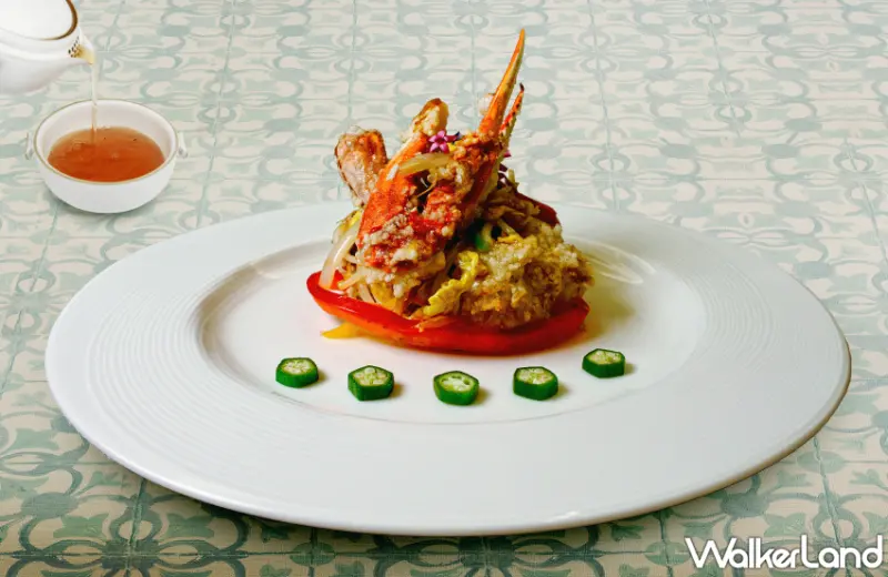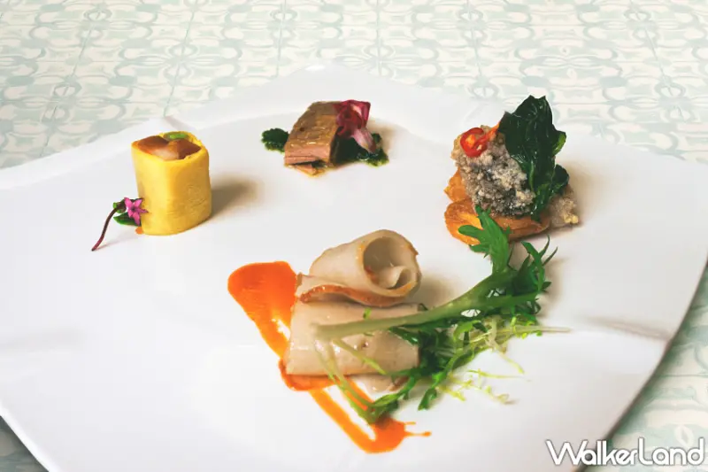 同時,還有「桃園七味豬吋骨」採用台灣豬後腿上的吋骨部位,以港式避風塘的料理手法烹調,香氣四溢酥脆有嚼勁,灑上日式七味粉更增添層次風味,搭配烤得酥脆的哈斯麵包,重口味卻不膩口的亮點菜色。「彰化蘆筍龍虎捲」選用新鮮的石斑魚,肉質Q彈,最上層鋪放魚子醬及海膽醬,與石斑天然鮮甜海味完美結合,畫龍點睛的醬汁點綴提升口感層次,佐白蘆筍以及玉子燒口感清爽細膩。