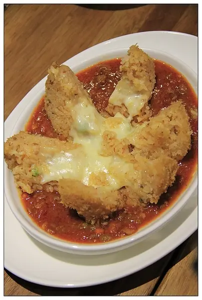 內部的餡料除了起司之外還有青豆~再搭配外圍的番茄肉醬一起入口~