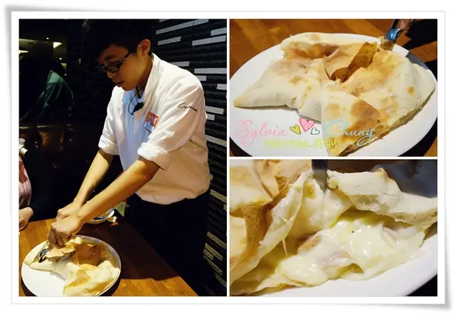 澎澎的枕頭披薩,裡面有空氣,Toy先為我們在餅皮上中間切開,壓一壓讓空氣擠出,