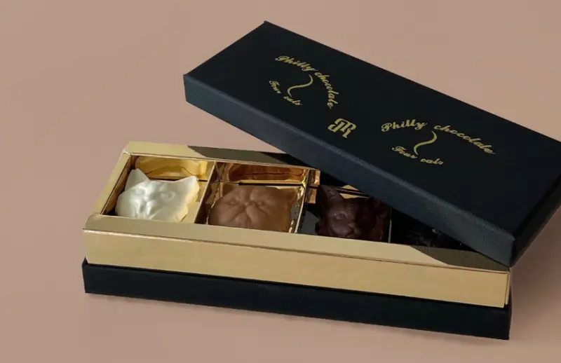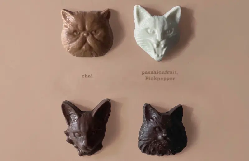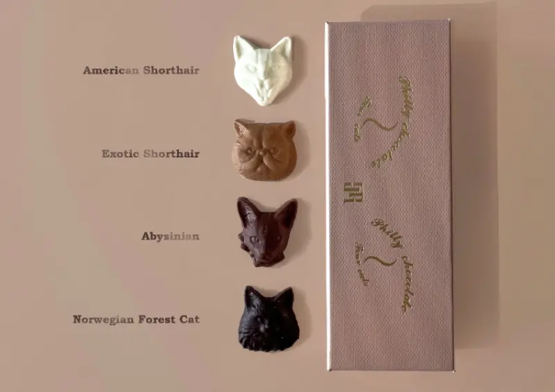 Philly chocolate 這品牌致力於創造出「前所未見的巧克力」。繼每年都會售罄的巧克力棒棒糖之後,Philly chocolate又研發了「貓咪造型酒心巧克力」(キャットボンボンショコラ」)。貓頭造型巧克力共有4種口味,分別是茶味的異國短毛貓和百香果風味的美國短毛貓等。在2023年7月31日至8月6日的7天內,Philly chocolate更在新宿LUMINE百貨的B2展示空間進行期間限定的線下展售。![]()