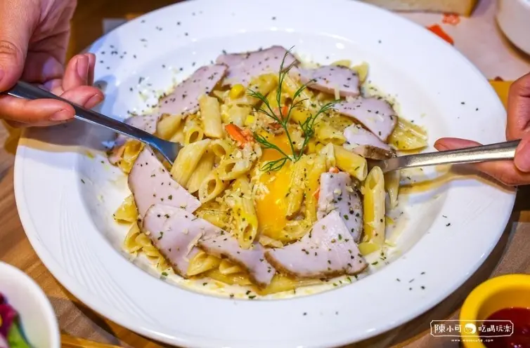 手工製作的奶油白醬,散發濃郁風味,柔滑而不油膩。店家自製熟成火腿則帶有獨特的鹹香,口感略帶嚼勁,搭配上Q彈的尖麵,非常好吃呢!<全文介紹>
