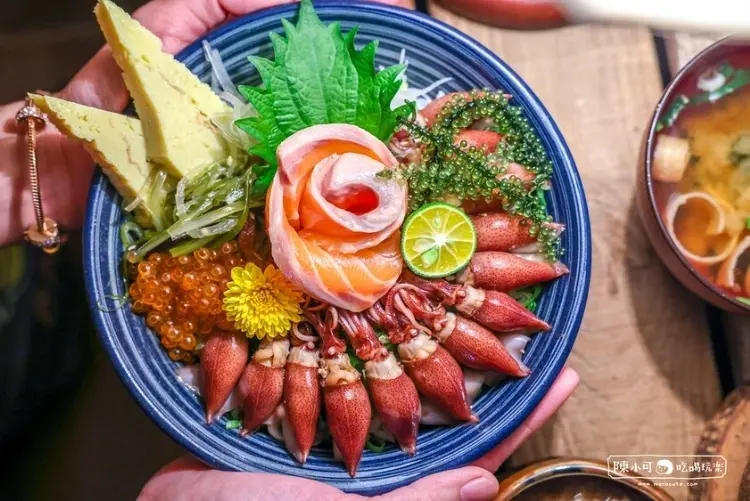 「終於衷魚」菜單提供丼飯、生魚片、炸物、茶碗蒸和各式飲品,浮誇又好吃的擺盤呈現是網路和IG打卡常出現的新莊美食。<全文介紹>