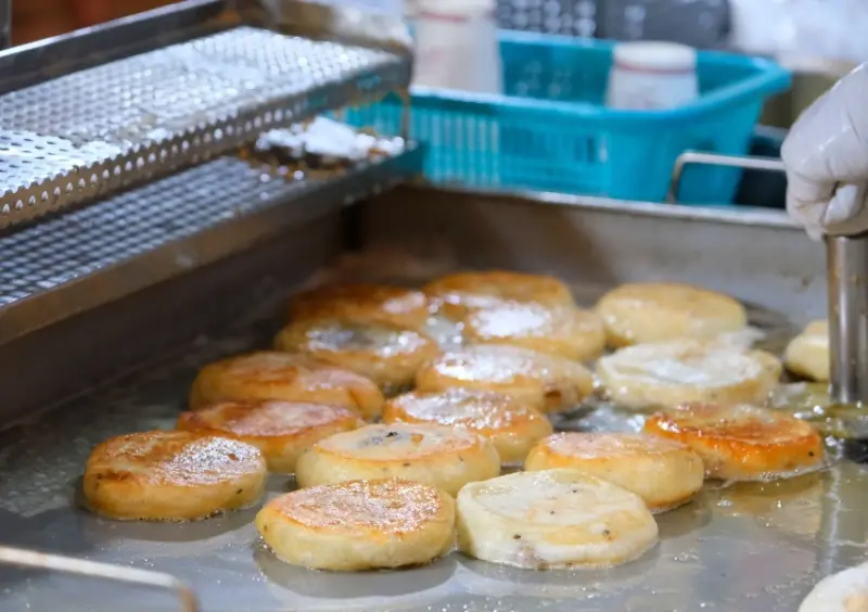 韓國各地街頭隨處可見的糖餅,半煎炸的方式、不時用器具壓扁讓麵團慢慢膨脹,一般常見的口味為黑糖,但在釜山則是有特色堅果黑糖餅,是今年韓國美食100選中高居第二名最想吃的美食。在海雲台傳統市場中有三間黑糖餅店,每間都是排隊名店。![]()