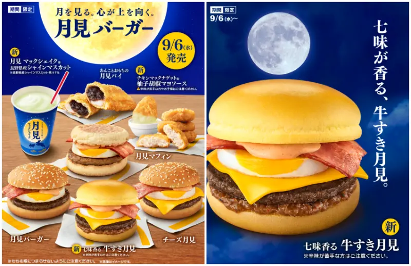 麥當勞一年一度的「中秋大戰」又來了!每年只要一到秋季,就是日本各家餐飲業者的「月見餐點」之戰,身為速食業龍頭之一的麥當勞在日本已經推出超過30年的「月見漢堡」,不僅口味越來越豐富,就連其他點心類也加入這場美味的戰局,今年更推出全新的「七味牛肉壽喜燒月見漢堡、晴王麝香葡萄奶昔、柚子胡椒美乃滋雞塊」等商品,準備領軍共7大品項的「月見家族」來橫掃速食控的味蕾和錢包了。
