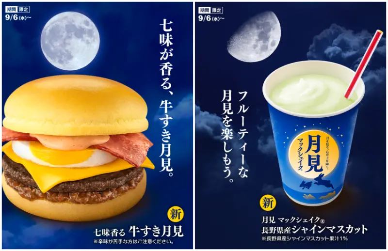 今年領軍主推的新商品就是「七味牛肉壽喜燒月見漢堡」,特別使用了100%無黏著劑的牛肉排,並放入象徵滿月的金黃色荷包蛋,最上面則是煙燻培根與濃郁的切達起司片,再用甜鹹交織的壽喜燒風味醬汁與七味粉調味,帶來嶄新的味覺體驗;「麝香葡萄奶昔」則是為了今年的月見奶昔而開發出的全新風味,特別使用了長野縣產的晴王麝香葡萄果汁作為原料基底,既濃郁又清新的特殊口感,絕對是奶昔控不可錯過的神級飲品。