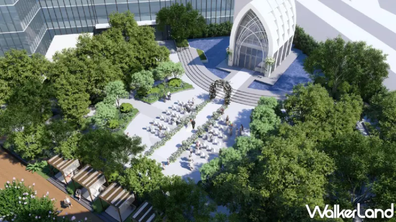 而在軟體部份,也禮聘兩位國際知名設計大師:室內設計及珠寶設計巨擘胡德如女士和國際知名花藝大師齊云老師,針對飯店內整體空間陳列及室內外花卉植栽和喜宴桌花設計出呼應四季和花園概念的創意花藝,同時,在位於飯店5樓的戶外禮堂,也打造了一處融入天空森林的「秘密花園」,新人可以在如森林般的綠意和花欉中完成一場夢幻的證婚儀式和after party。
