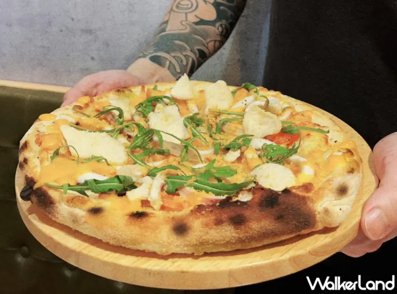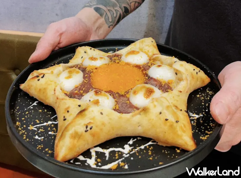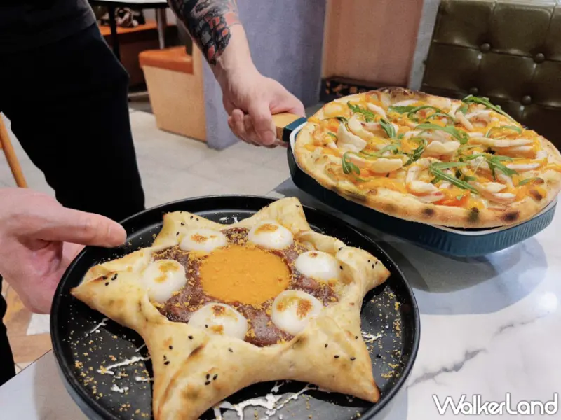 其中,「金沙鮮魷比薩」經400度高溫烘烤出微微焦香的義式豹斑餅皮,撒上鹹蛋黃與醬汁鹹香濃郁,搭配魷魚圈Q彈咬勁,加上蝦餅酥酥脆脆,一口吃進三種層次美味。此外,「金沙麻糬甜星」猶如披薩版本的麻糬蛋黃酥,金黃色鹹蛋黃流沙內餡,香濃滑順,與烏豆泥鹹甜交融配搭得天衣無縫,加上客家傳統麻糬的糯米香氣,軟Q香甜不膩。