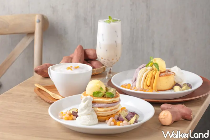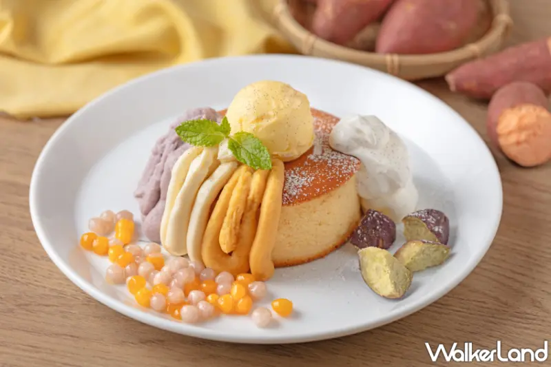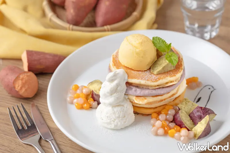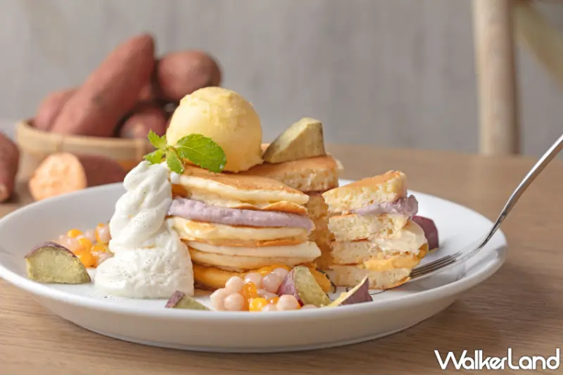 另款顏色呈淡紫的奶油,特別選用紫薯搭配芋泥調製,風味看似濃厚,但吃起來清新不膩。同時,為了讓消費者能品嚐日本農業研究中心所改良的關東85號,特別整塊保留紅皮供應,能感受到甜薯略帶天然栗子香氣、纖維細緻的獨特風味。無論是Q彈薄鬆餅夾著三色薯泥的吃法,還是扎實厚鬆餅旁濃郁的三色奶油瀑布,都能品嚐得到台日甜薯的香甜滋味。