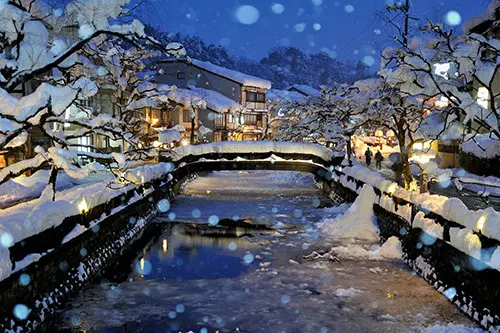 到了冬季,溫泉街兩旁輕柔下垂的楊柳枝葉及店家們,都紛紛戴上了雪白的厚帽子,使原本就被評選為米其林級景色的街道又更增添一份浪漫風情。除了置身溫泉鄉內,不妨搭乘纜車至城崎溫泉總本山「大師山」山頂,從展望台上一覽鑲嵌著紛紛白雪的群山及城崎溫泉;來到山上也不怕寒風刺骨,可在一旁的咖啡廳「MIHARASHI Cafe」買杯暖暖的咖啡,享受雪白美景後,回到城崎溫泉泡個外湯暖一下,再大啖松葉蟹料理,想必為最奢侈的享受。![]()