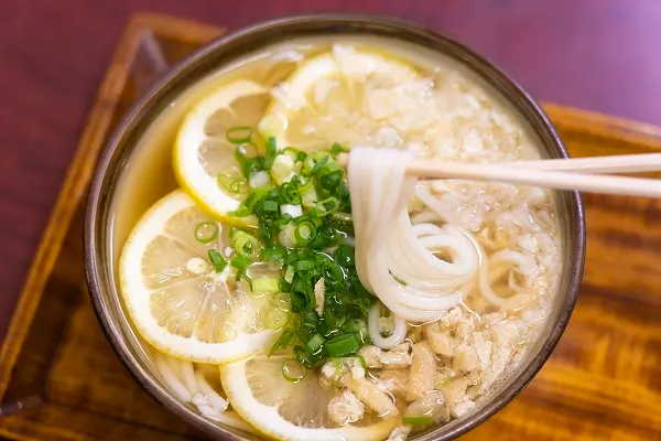 明治時期以來海軍重要據點的吳市,聚集了來自全國各地的海軍和海軍工廠工人,讓吳市在短時間成了擁有40萬人居住的大城市,為了快速供餐,靈機一動將烏龍麵切成細條狀,成為淋上滾燙的高湯就能快速上桌的「細烏龍麵」。「細烏龍麵」不僅大受歡迎,也因而衍生多種特色吃法,例如搭配瀨戶內產的檸檬、吳市獨有的「細烏龍麵廣島燒」等,都是在廣島才吃得到的特色美食。
