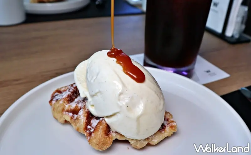 餐後甜點絕不可錯過「可頌鬆餅 / 海鹽焦糖 / 香草冰淇淋」,將具嚼勁的可頌麵團壓製為格子鬆餅造型,搭配甜而不膩的海鹽焦糖醬和手工製作香草冰淇淋,經典不敗的組合,為法式盛宴完美作結。