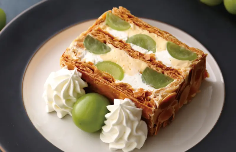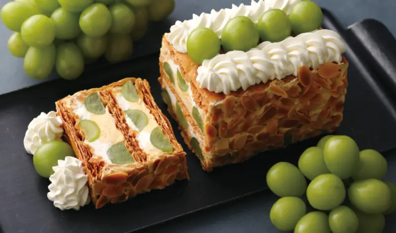 2023年秋天,KIHACHI以晴王麝香葡萄(シャインマスカット)作為主角,在蛋糕上精心疊加香緹鮮奶油(Crème Chantilly)、卡士達鮮奶油餡(Diplomat Cream),中間則以酥脆的餅皮層層堆疊,打造出「KIHACHI獨特的晴王麝香葡萄派」。香緹鮮奶油就是俗稱的擠花,口味鮮甜、造型可愛;至於卡士達鮮奶油餡則是將經典的卡士達醬混合打發鮮奶油,打造出混合的蓬鬆口感。整體來說,這款美味的派點結合了店內香脆的餅皮、順滑的奶油,以及晴王麝香葡萄本身的爽甜和濃郁香氣,非常適合作為餐後甜點。![]()