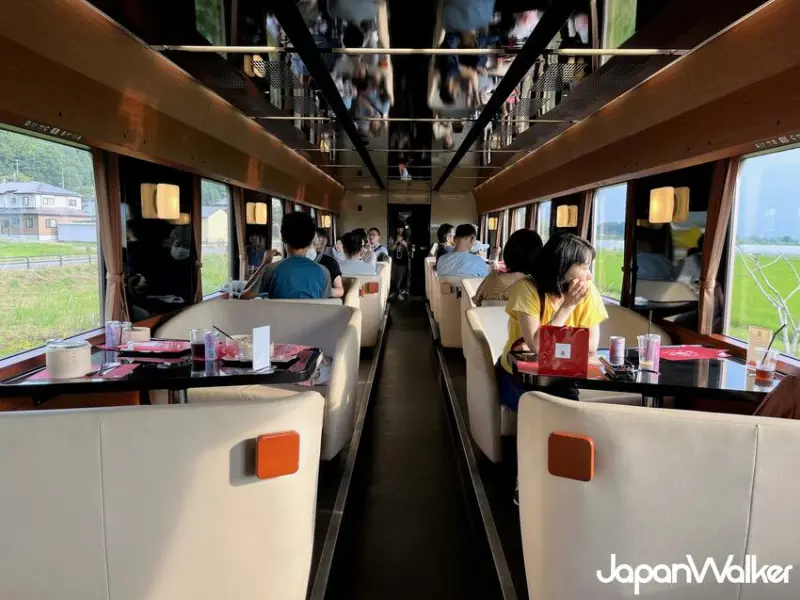 「FruiTea 福島號」行駛於「喜多方-郡山」之間,列車共分為2節車廂,一節為座位區、一節為吧台區。座位區最多可容納36名乘客,從單人桌位、雙人座位到四人座位都有,就算是一個人前往的旅客,也能在不受打擾的空間一邊看著窗外的田園風光,一邊獨自享受美味的下午茶時光。