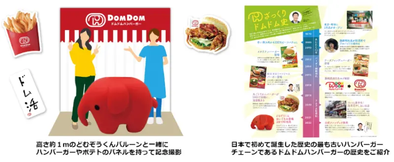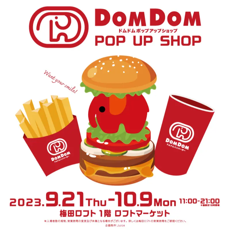 大阪梅田LoFT的DOMDOM POP UP SHOP於2023年9月21日至10月9日登場,快閃店展示了DOMDOM的歷史年表、過去販售過的漢堡及未公開漢堡的展示板,還有DOMDOM療癒吉祥物「DOM大象先生(どむぞうくん)」的合影留念區等,直接勾起饕客們的回憶,忍不住想來份漢堡。![]()