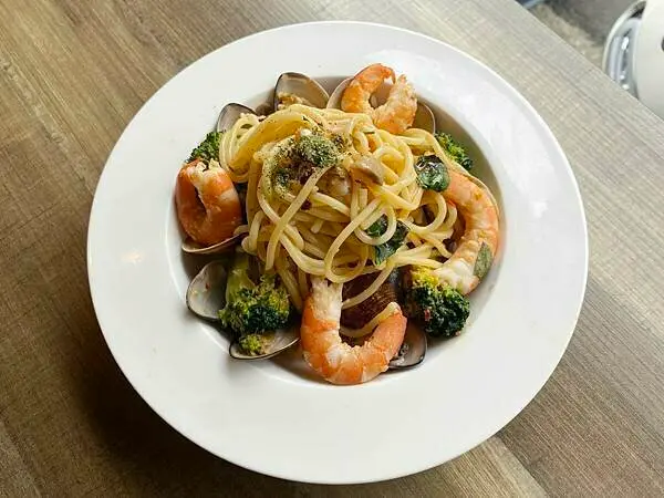 蝦子飽滿肉質Q彈,非常的新鮮,麵量中等帶有口感,蛤蜊跟蝦子都很新鮮,花椰菜也鮮脆,蒜味跟辣味搭配得相當合適,蒜香有出來,又不會太重,不是讓人嗆鼻的辣,而是辛香料的辣...<全文介紹>