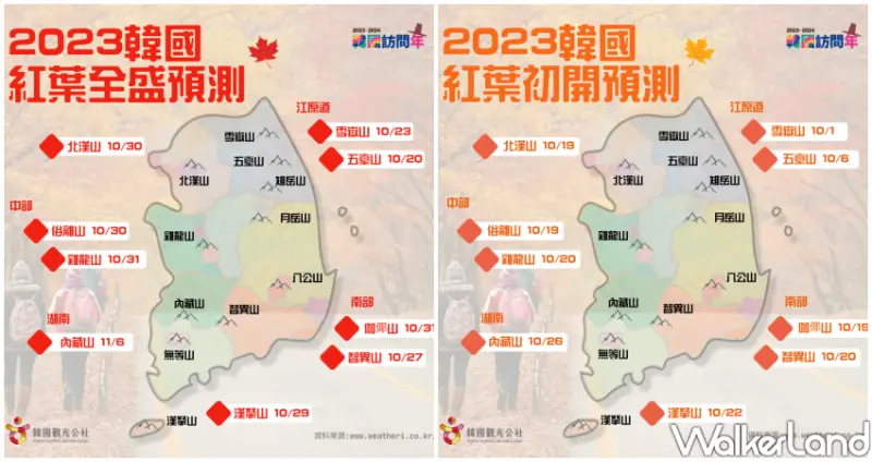 2023韓國賞楓預測圖出爐了!對於熱愛去韓國遊玩的旅客而言,「賞楓、賞櫻預測圖」公告是每年最期待的事情,希望在出國遊玩的日子裡,能拍出絕美風景照。今年因氣候影響導致「2023韓國賞楓預測」比起往來來的更晚,預計將於10/1從雪嶽山開始轉紅,一路向南擴散至全韓國,楓紅全盛期預計落在10月底至11月中旬。![]()