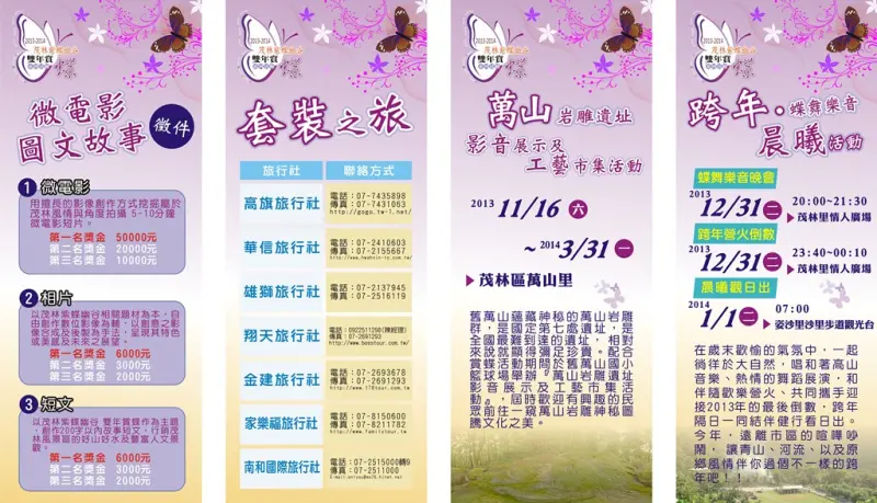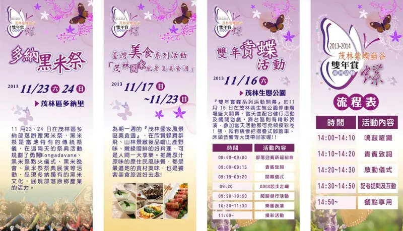 由交通部觀光局茂林國家風景區管理處規劃的「2013-2014茂林紫蝶幽谷~雙年賞蝶系列活動」即將於11月16日隆重登場,在長達4個半月期間除賞蝶活動外,受到遊客喜愛的「多納黑米祭」及列為國定第七處遺址的神秘「萬山岩雕群」影音展亦將列入系列活動中,還有別具特色的跨年音樂晚會,內容十分豐富,歡迎國內外遊客到高市茂林區暢遊。今年主辦單位特別推出微電影、短文及照片的徵件活動,參與的遊客有機會獲得新台幣五萬元的大獎。