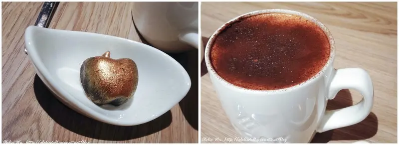 麵包旁邊是焦糖巧克力杏仁豆,將70%的巧克力與可可粉包覆杏仁豆