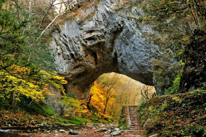 位於廣島縣北部的「帝釋峽」,不僅是日本百景,也是廣島縣代表性的賞楓名勝之一。全長18公里的石灰岩溶岩峽谷,展現了變化萬千的溪谷之美,有世界三大天然橋「雄橋」、200公尺長的鐘乳洞「白雲洞」及3億年前形成的急流「斷魚溪」等自然奇景,加上與自然融合的人造湖「神龍湖」,富有變化的景緻,媲美電影場景,其中每年的10月下旬到11月上旬,則是季節限定的賞楓最佳觀賞期。