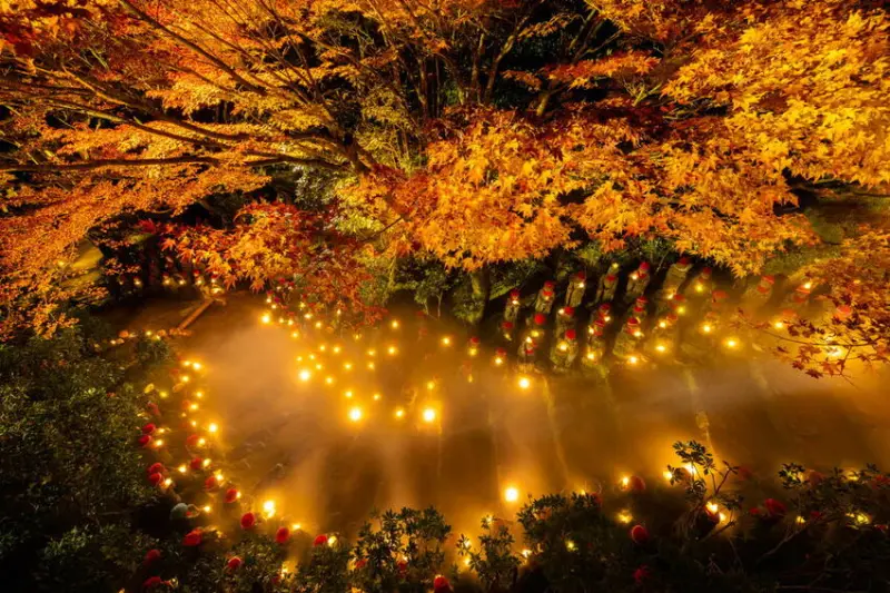 有著世界遺產的日本三景之一宮島,秋季是最多遊客造訪的季節,位於宮島彌山山腳下的「紅葉谷公園」,更是首屈一指的賞楓名勝。約700株的楓紅渲染整個公園,遍地楓葉宛如迎接貴客到來的紅地毯。不單是白天的行程,晚上的夜楓點燈才是重頭戲,今年的點燈活動於11月3日至26日,每天日落後至晚間8點間進行,在燈光的照射下,楓葉就像是紅寶石般閃耀著,與園區內的造景相映成趣,營造出浪漫的夢幻氛圍,令人沉醉。