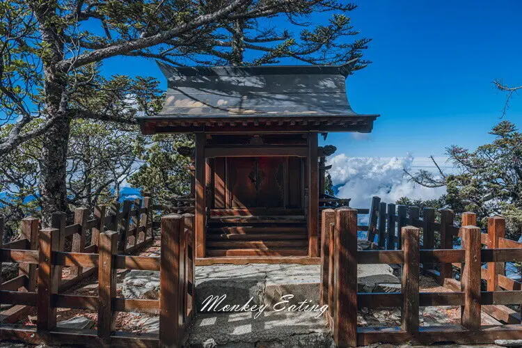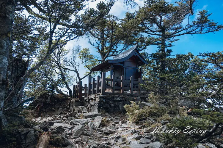 玉山西峰三角點後方會有一段路下切,約100m會抵達號稱全台最高的日本神社,也是熱門打卡點之一。神社以後方的山景做背景,更襯托出它的美麗...<全文介紹>