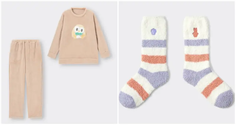 女性居家服以GU近年最流行的珊瑚絨睡衣「Marshmallow Feel Lounge Set」為基礎來設計,由於質地細膩、觸感柔軟,在冷天裡也具有一定程度的保暖性,配上印在衣服正中央的皮卡丘、木木梟、妙喵,這個冬天都不知不覺一起被溫暖了;如果雙腳容易冰冷的話,也別忘了穿上毛巾布材質的Poké Peace絨毛襪子,這系列共有3款樣式,不管是哪一款,成對的兩隻襪子上都會分別繡上不同寶可夢的身影,營造出小小的驚喜感。