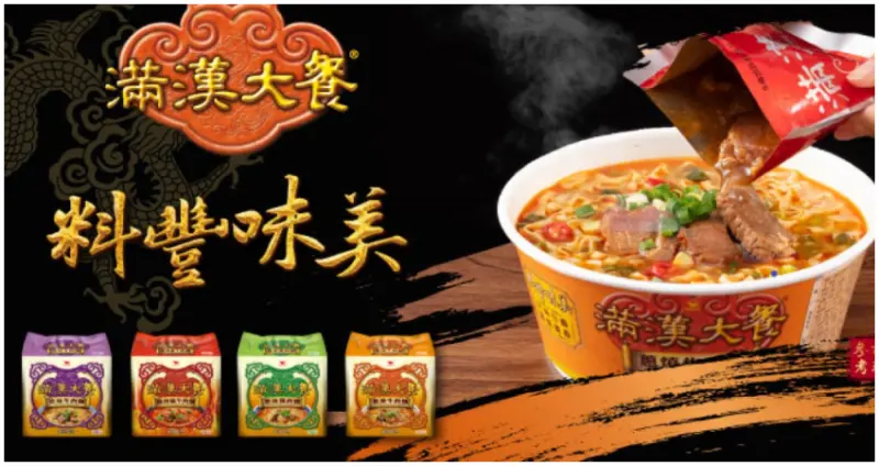 滿漢大餐是臺灣牛肉麵文化的代表品牌之一,身為開創臺灣豪華速食麵的先鋒,自1983年推出第一款附有料理包的「滿漢大餐-珍味牛肉麵」問市,即熱賣至今,亦征服不少海外粉絲的心,「有真的肉!」是國外網友對滿漢大餐的最大驚呼亮點,更是被(韓國綜藝節目)選為臺灣第一名的泡麵 。![]()
