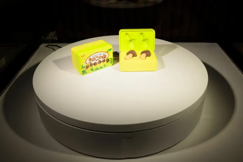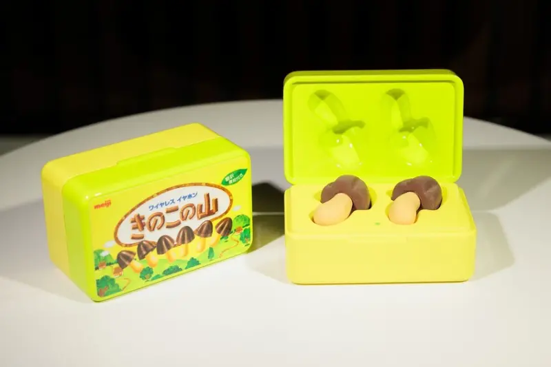 幾乎跟本尊一樣大小的「蘑菇山巧克力藍芽耳機」,遠遠看起來真的會以為有人把零食塞在耳朵裡,微獵奇的設計成功引起網友注目,還被日本的電視台報導過!而且不只耳機還原蘑菇山巧克力的造型,就連收納盒的外觀都很細心地設計成蘑菇山巧克力的市售包裝,不得不佩服日本人重視細節的態度與美感。